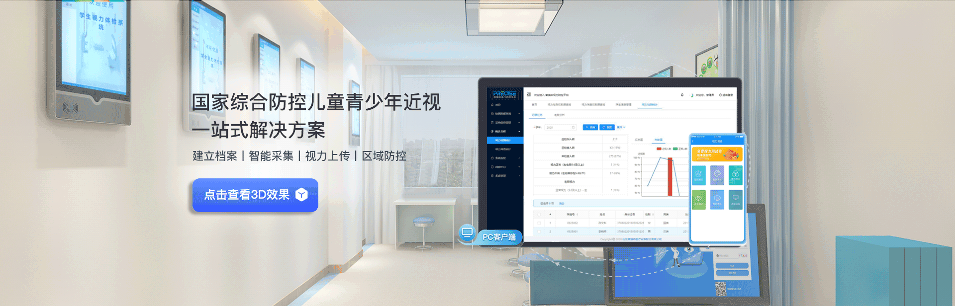 普瑞森青少年視力防控平臺是運用互聯網、物聯網和移動通信等技術快速篩查青少年視力并建立健康檔案的系統。由近視防控數據管理軟件系統、電子視力檢測儀、視力篩查儀組成,通過視力檢測篩查設備,自助采集匯總數據并上傳至云平臺。支持視力數據采集、查詢、統計、分析、存檔于一體,通過分析體檢者視力發展趨勢,對不同視力人群進行健康干預和指導。