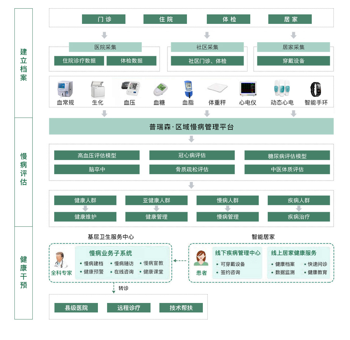 慢病管理整體解決方案通過建立一個(gè)覆蓋醫(yī)院、社區(qū)服務(wù)中心、鄉(xiāng)鎮(zhèn)衛(wèi)生院以及村衛(wèi)生室的區(qū)域慢病管理平臺(tái),通過整合門診、住院、體檢等健康數(shù)據(jù)和采集慢病健康自助一體機(jī)、健康隨訪包等設(shè)備健康信息,打造區(qū)域慢病大數(shù)據(jù)中心,為當(dāng)?shù)芈「呶;颊哌M(jìn)行高效篩選、有效評(píng)估、精準(zhǔn)干預(yù)、及時(shí)隨訪等一體化的健康管理閉環(huán)服務(wù),從而快速打造慢病防治干預(yù)的三級(jí)(二級(jí)醫(yī)院、鄉(xiāng)鎮(zhèn)衛(wèi)生院/社區(qū)衛(wèi)生院、村衛(wèi)生室)服務(wù)體系,有效提高慢病管理的效率。