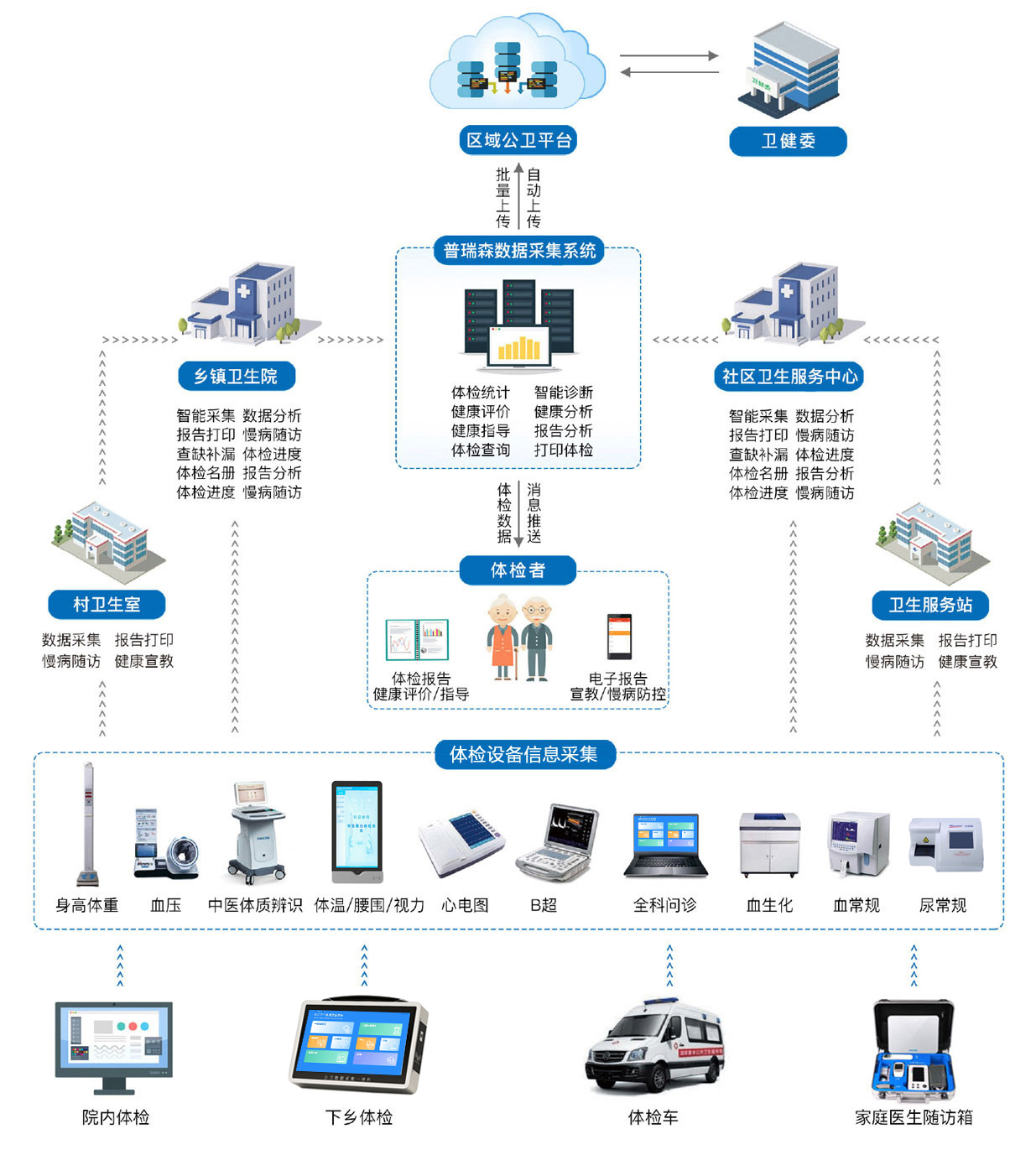 普瑞森公衛(wèi)數(shù)據(jù)智能采集系統(tǒng)一一縣鄉(xiāng)村一體化方案以滿足公衛(wèi)考核為基本要求,充分緩解基層公衛(wèi)人員入手少,任務(wù)重的問題,充分調(diào)動(dòng)鄉(xiāng)鎮(zhèn)衛(wèi)圭院和村衛(wèi)生室的積極作用,通過智能建擋和高效體檢以及健康數(shù)據(jù)實(shí)時(shí)傳輸?shù)葮I(yè)務(wù),為全域居民建立“以健康為中心、以數(shù)據(jù)為依托”的健康服務(wù)體系,利用物聯(lián)網(wǎng)+智能信息化應(yīng)用,建設(shè)統(tǒng)一、規(guī)范、標(biāo)準(zhǔn)的慢病管理中心,提升基層醫(yī)生對(duì)慢病患者的服務(wù)質(zhì)量和管理水平。